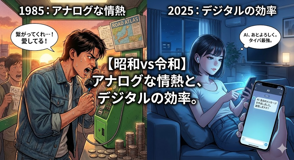 1985年は、とにかく「手間」がかかる時代でした。 情報を得るのに走り回り、愛を伝えるのに勇気を振り絞り、失敗しては傷つき、それでも何とか生きていました。でも、その「手間」の中にこそ、忘れられない思い出やドラマが詰まっていた気がします。