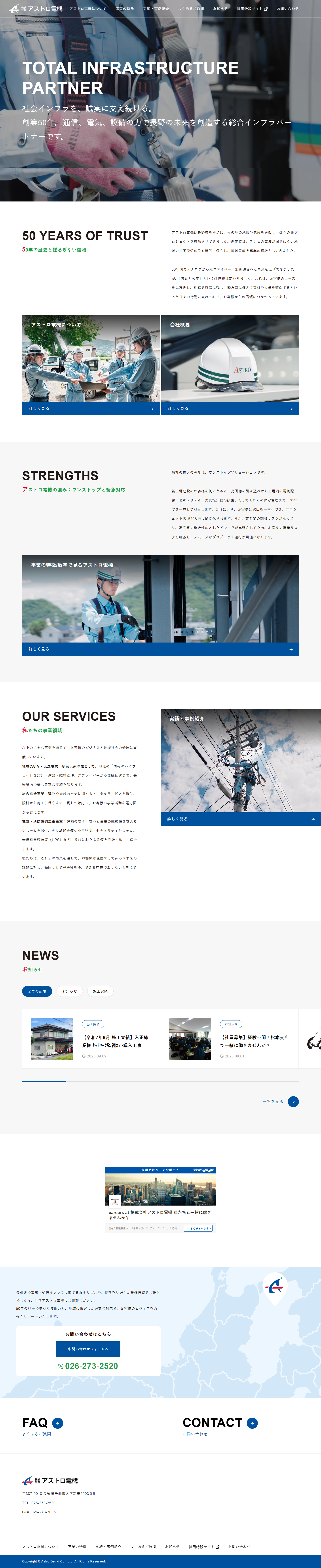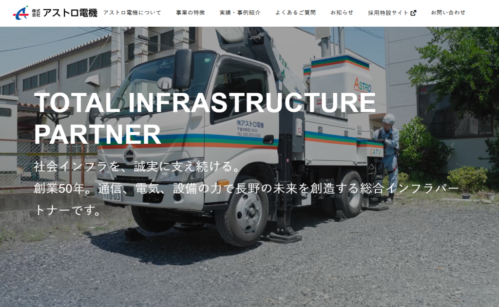 長野県千曲市で総合インフラ事業を展開する株式会社アストロ電機様の、企業の信頼性向上と受注拡大を目的としたサイトです。